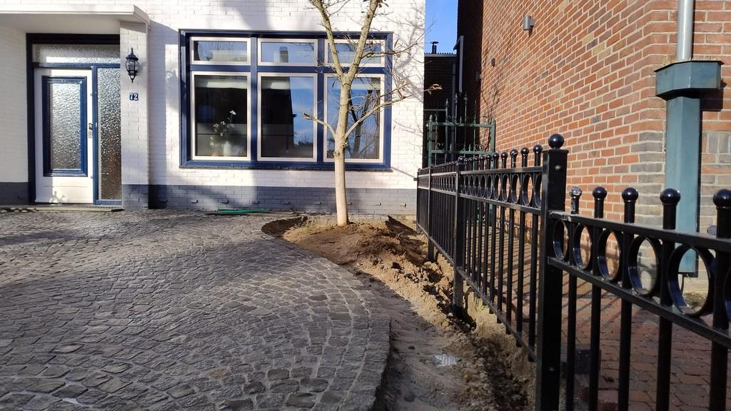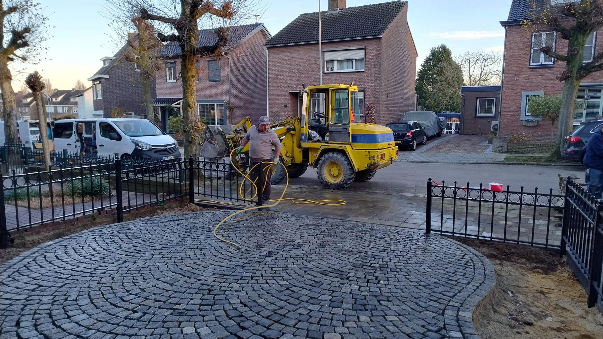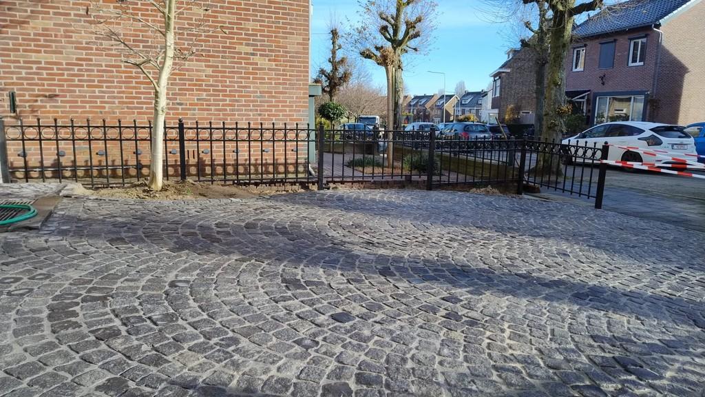 In deze voortuin is een bestrating gerealiseerd met grijze genuanceeerde kinderkopjes van graniet en basalt. Daarnaast is er met rondingen gewerkt, de bewoonster heeft zelf het ontwerp gemaakt. En de bestrating is mooi ingesloten door groene borders.